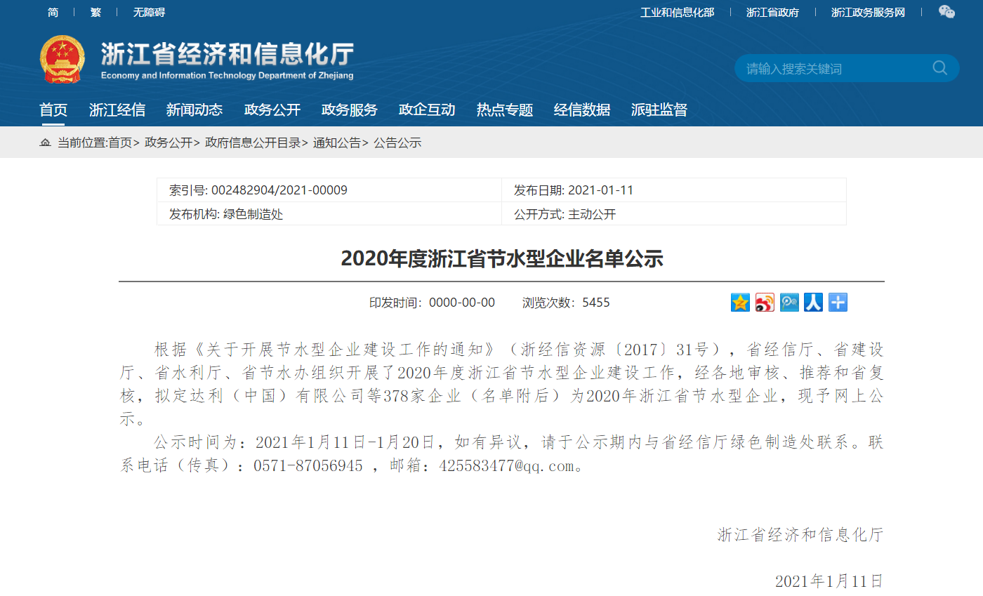 公司入選2020年度浙江省節(jié)水型企業(yè)名單