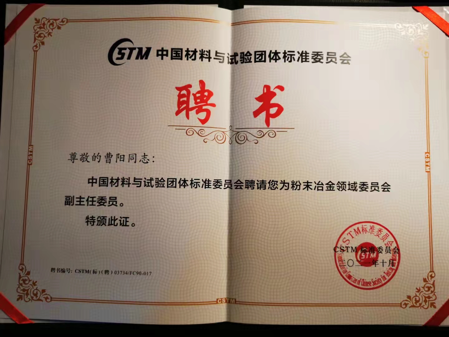 公司副總經(jīng)理曹陽(yáng)被CSTM/FC90和CPMA標(biāo)委會(huì)聘為副主任委員
